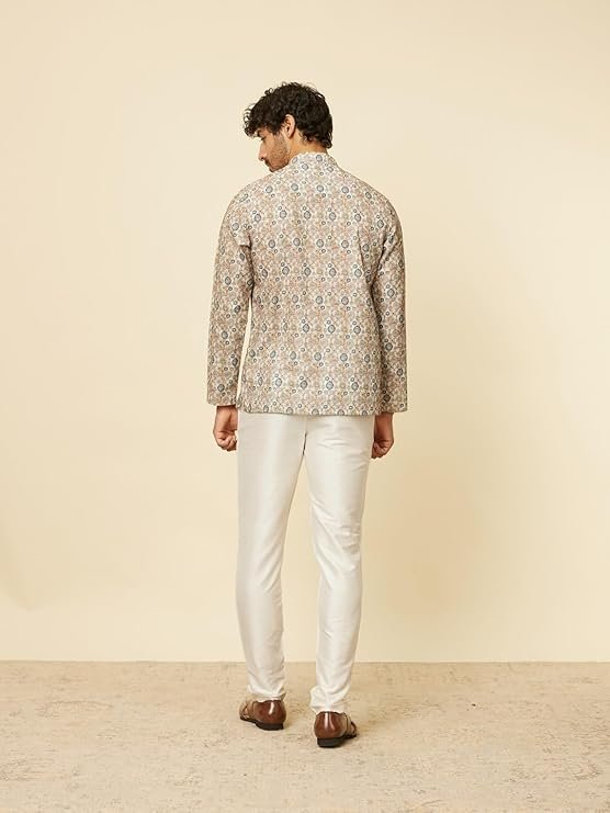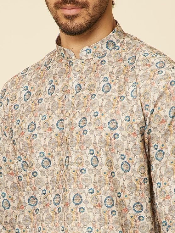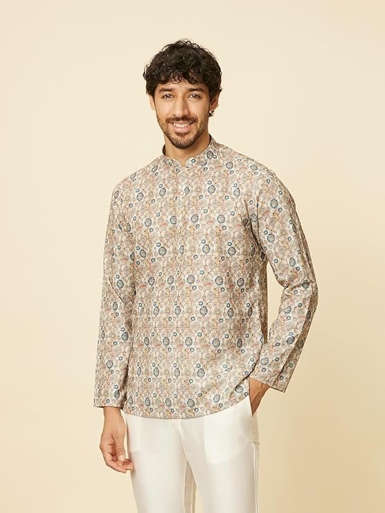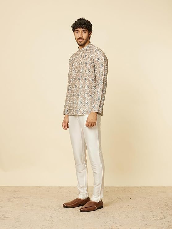 - Design:-Dive into the intricate design with our beige short kurta, adorned with buta motifs and articulated through a neat buttoned placket and distinguished bandhgala collar. Pair with white pants and brown sandals.