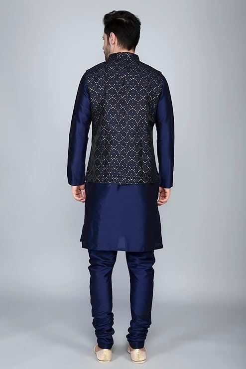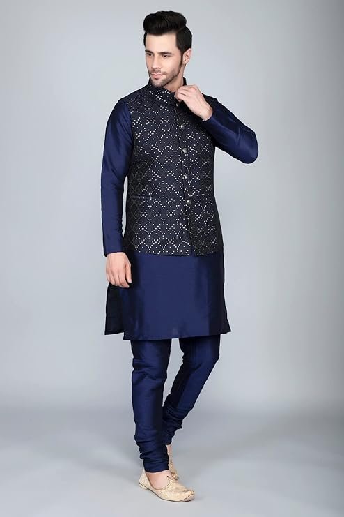 Men’s Silk Blend Kurta Churidar Pyjama with Ethnic Bundi Jacket Set