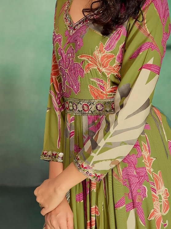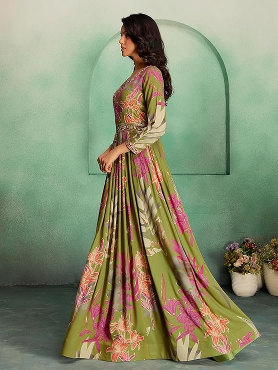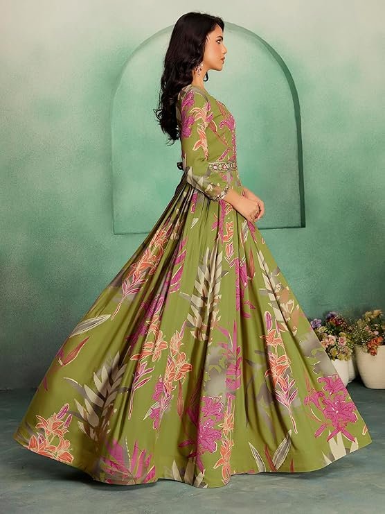 • STAND OUT FROM THE REST: Keeping in mind the latest fashion trends, this designer Long Gown is made to help you make a bold fashion statement. The Mehndi(Green) and multi-color long Gown dress for women’s Latest Design pattern highlights the color of your choice which is accented further.